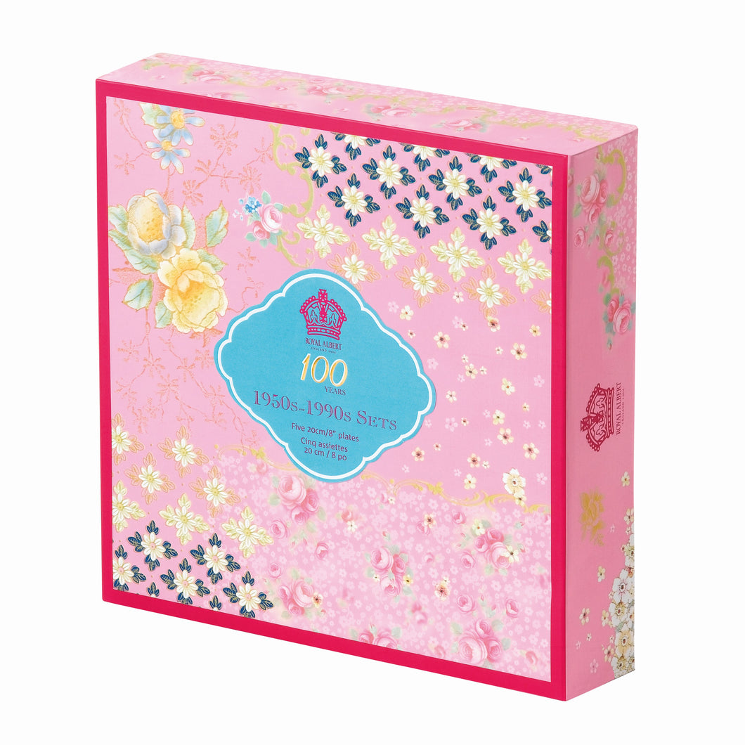 The 100 Years of Royal Albert 5-Piece Plate Set (1950-1990) brings a modern expression of afternoon-tea parties of the past into your home for a delightful centrepiece to your tableware. Transform your humble tea and cake party into an idyllic setting with each of these plates that all commemorate a design from their chosen decade, bringing an eclectically stylish look to your place settings ready for sweet treats and an afternoon of luxury. Each plate has been shaped into a 20cm size with a delicate ruffled finish and edged with a beautiful 22-carat gold trim to enhance the high-quality feel. Pops of colour such as pale pastel blue and blush pink are decorated with beautiful florals typical of their time; elegant gold flowers from the 1960’s contrast against softer blooms of the eighties for a mix and match shabby chic appeal with a feel of superior quality. Dishwasher Safe: No, Microwave Safe: No, Is In Gift Box: Yes, Material: Fine Bone China.
